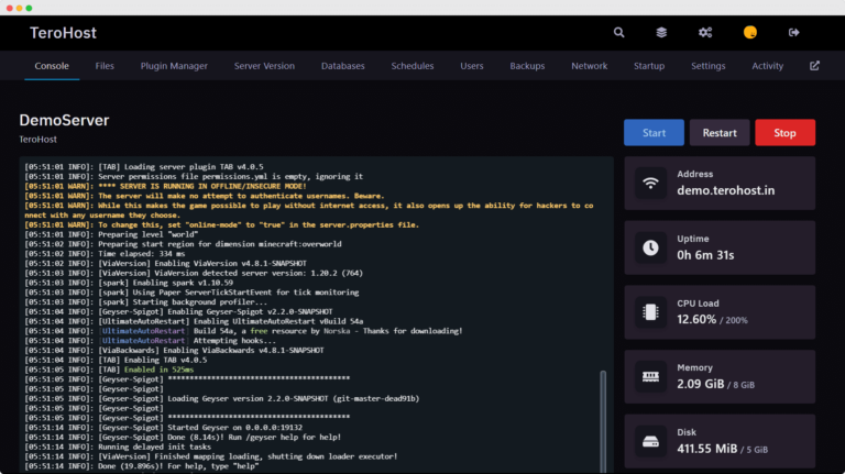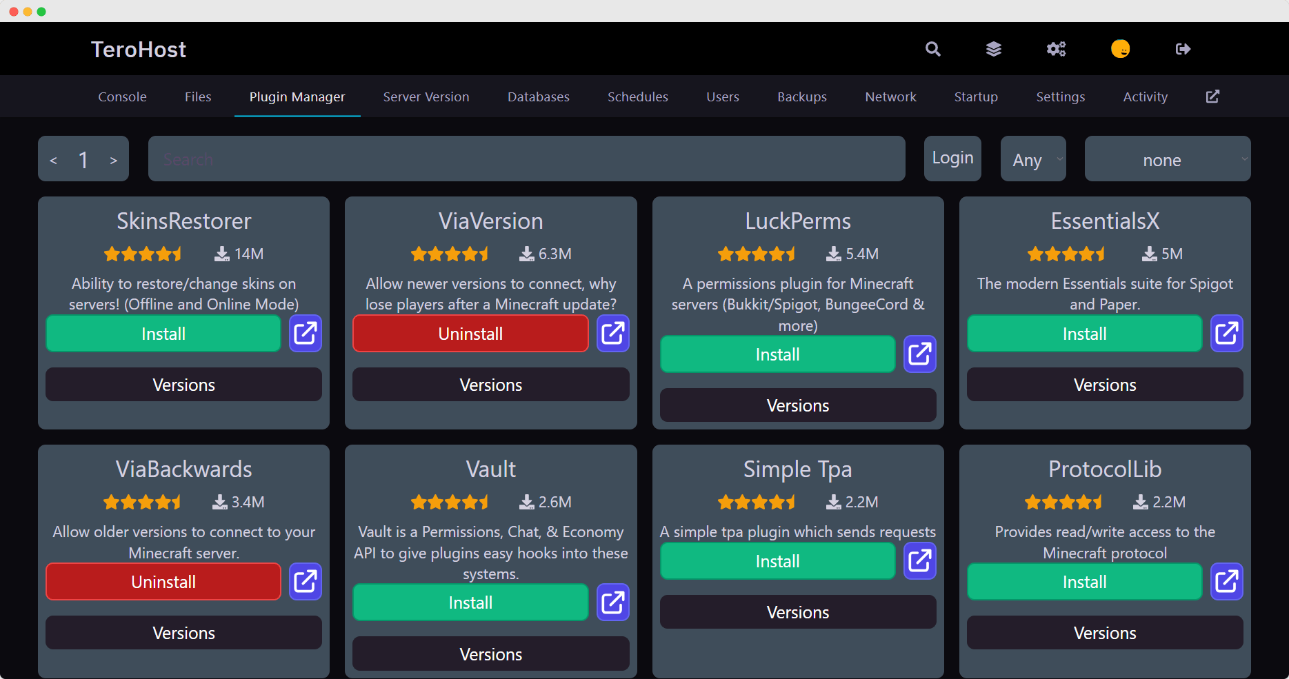 Find all your Minecraft plugins in one place inside our panel. No need to manually download and upload plugins. Add, remove, update plugins in 1-click.